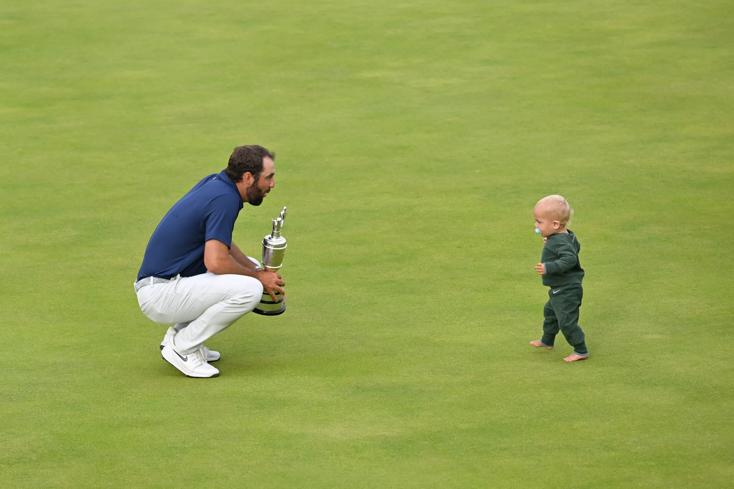 His four-shot victory at the British Open complete, Scheffler saw 15-month-old son Bennett coming toward him on the 18th green at Royal Portrush. The toddler face-planted going up the slope. Scheffler eventually scooped him into his left arm, his right hand holding the claret jug.